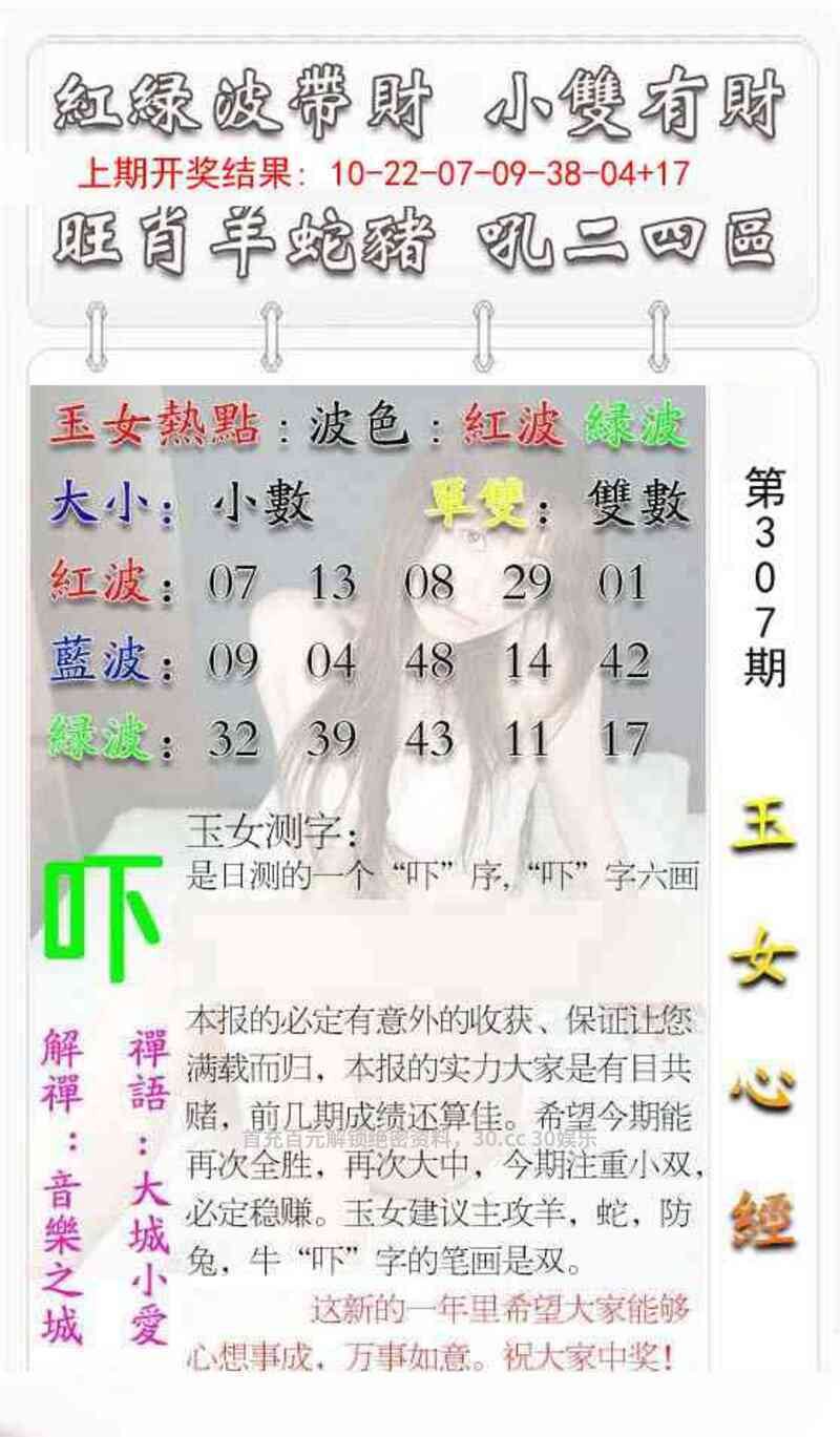 307期澳门彩票中心开狗20 波色:绿波蓝波 头数:123头 生肖:狗龙鼠兔猪虎牛鸡羊 平特:狗狗狗 主码:20,32,26,38,18,30 防码:27,19,28,17,33,35 |